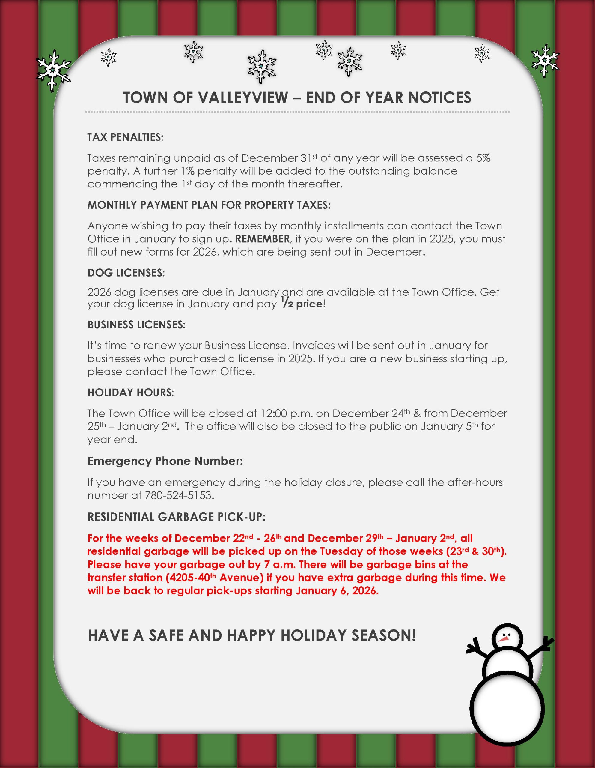 Did you know that, according to Town of Valleyview Waste Management Bylaw 2025-14, garbage carts must be placed out for collection no later than 7:00 a.m. on your scheduled collection day? Setting a consistent early time ensures our sanitation crews can follow their routes efficiently and avoid missed collections.