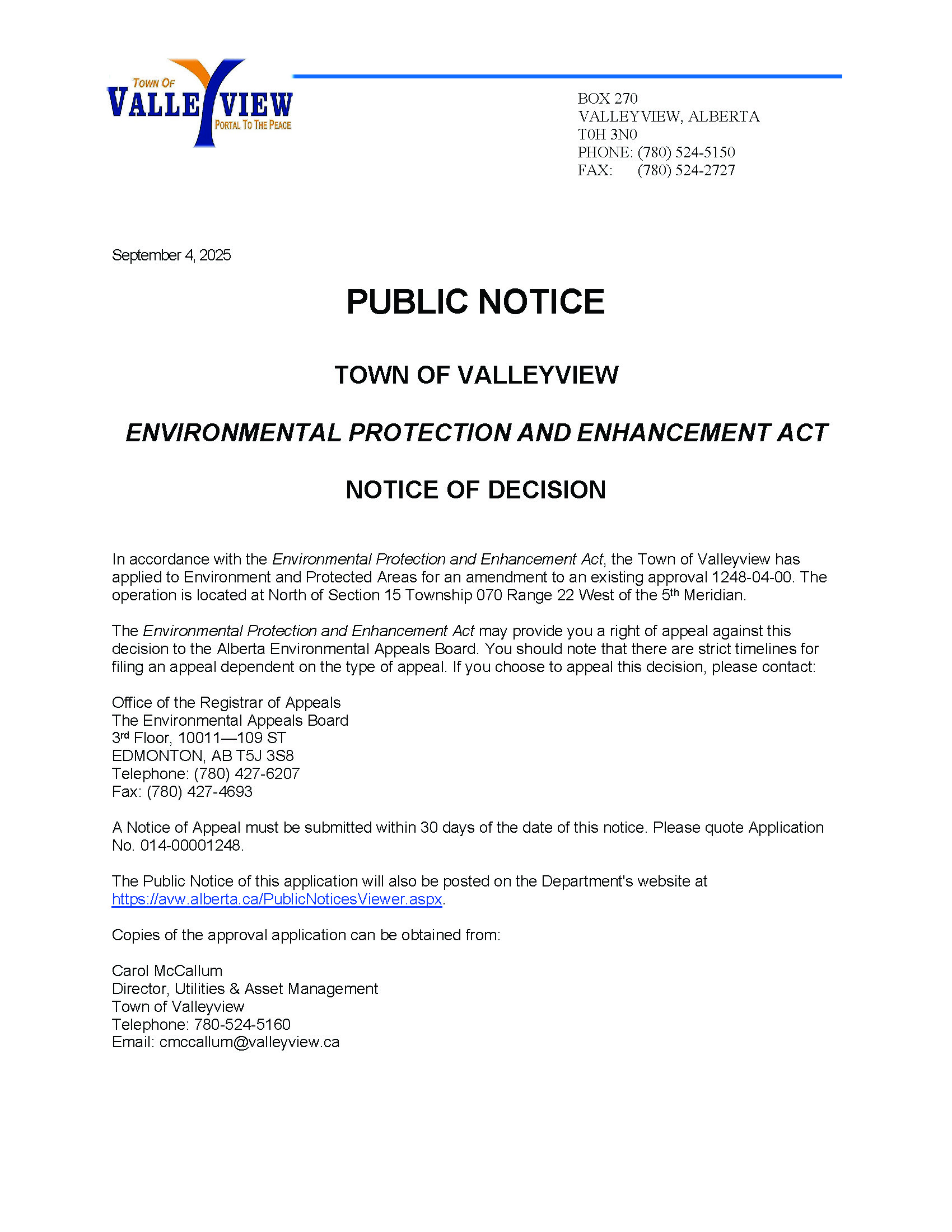 View Larger Image Notice of Decision Sept 4, 2025 Creedance Chowace2025-09-04T15:08:20-06:00September 4, 2025|Municipal News, NEWS, Utilities & Asset Management| Share This Story FacebookXRedditLinkedInWhatsAppTumblrPinterestVkXingEmail
