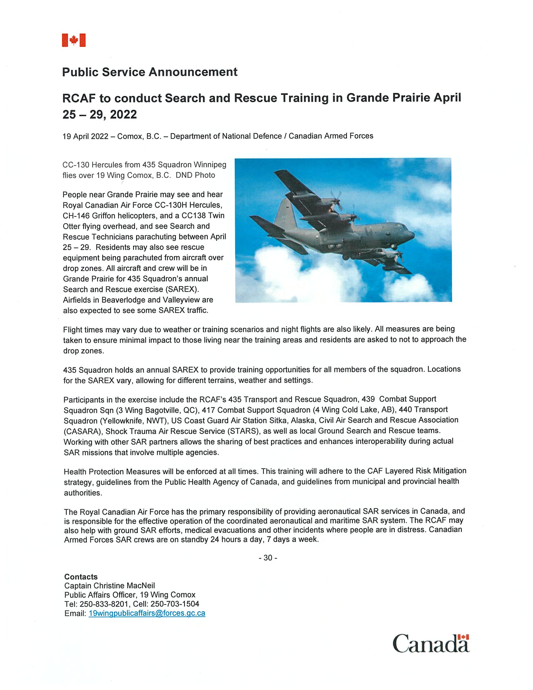 The Town of Valleyview Airport will host the Royal Canadian Air Force (RCAF) – Search and Rescue as well as Greenview Search and Rescue April 25-27 as they coordinate to perform training exercises at the local airfield.