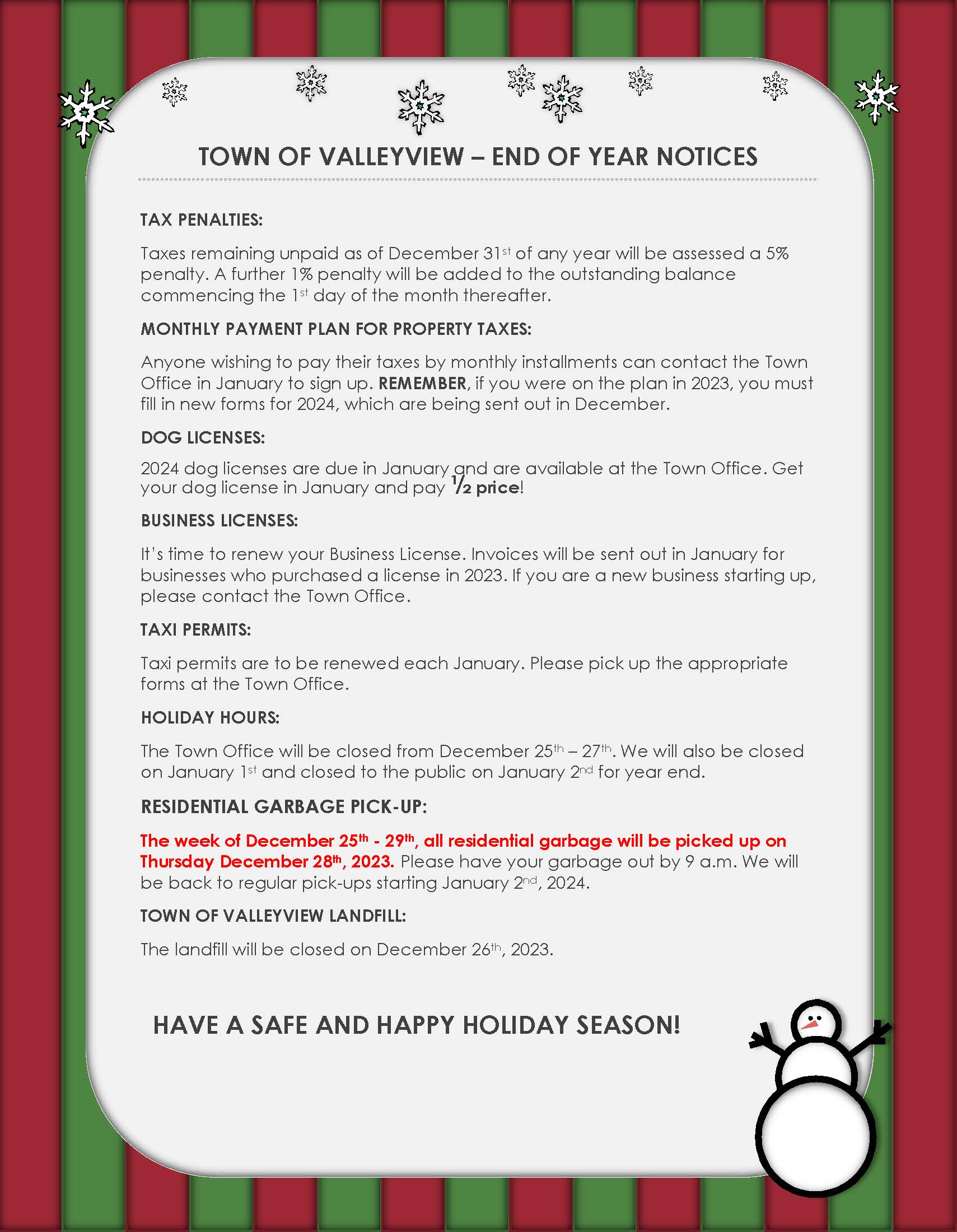 View Larger Image Town of Valleyview – End of Year Notice AAlmond2023-12-11T09:48:39-07:00December 11, 2023|NEWS| Town of Valleyview Year End Notice 2023 Share This Story FacebookXRedditLinkedInWhatsAppTumblrPinterestVkXingEmail